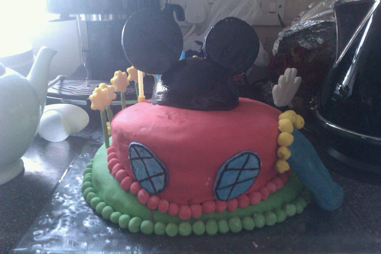 I hid all the ugly joins with little balls (yes, I know the green ones look like peas!) and stuck windows over the less-than-perfect bits of red fondant. The lines on the windows & handy helper and the letters on the flowers were painted on using a cocktail stick with the point cut off at an angle and dipped in food colouring like a quill. The silly slide was solid icing which I stuck on with a little water - edges scored first which helped it stick. Again, I hid the join with balls. The flower stems were made by dipping a cocktail stick in water before rolling a small ball of icing round it - the water helped it stick. Finally, the Mickey Mouse head - made from all the left over icing! I tried dying the whole lot black but it just didn't work so, lesson number three - just paint it!